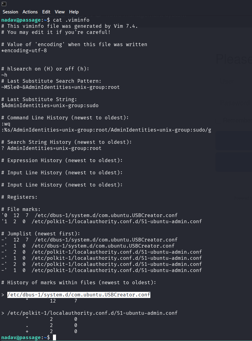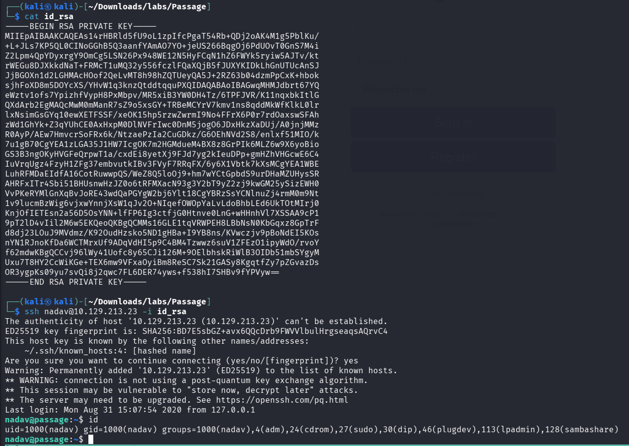 uid=1001(paul) gid=1001(paul) groups=1001(paul)successfully logged in! in paul’s .ssh directory, we can find ssh key. if we take a look at authorized_keys, there are nadav@passage texts, so that we can assume that nadav &paul share their ssh key. if we try, successfully login to nadav account with paul’s id_rsa key. (make sure you don’t forget chmod 600 id_rsa before trying to login)