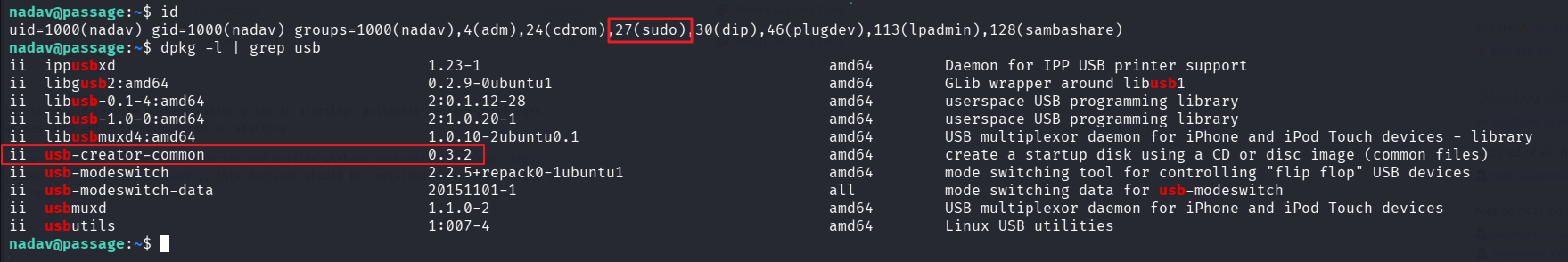 nadav account is in sudo group, and usb-creator version is 0.3.2. Let’s try exploit it.
