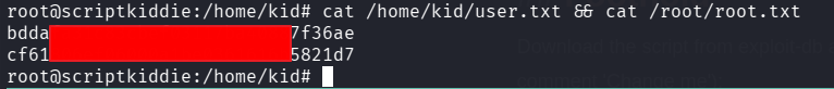 root@scriptkiddie:/home/pwn#플래그는 /home/kid/user.txt 및 /root/root.txt 에서 확인할 수 있습니다.